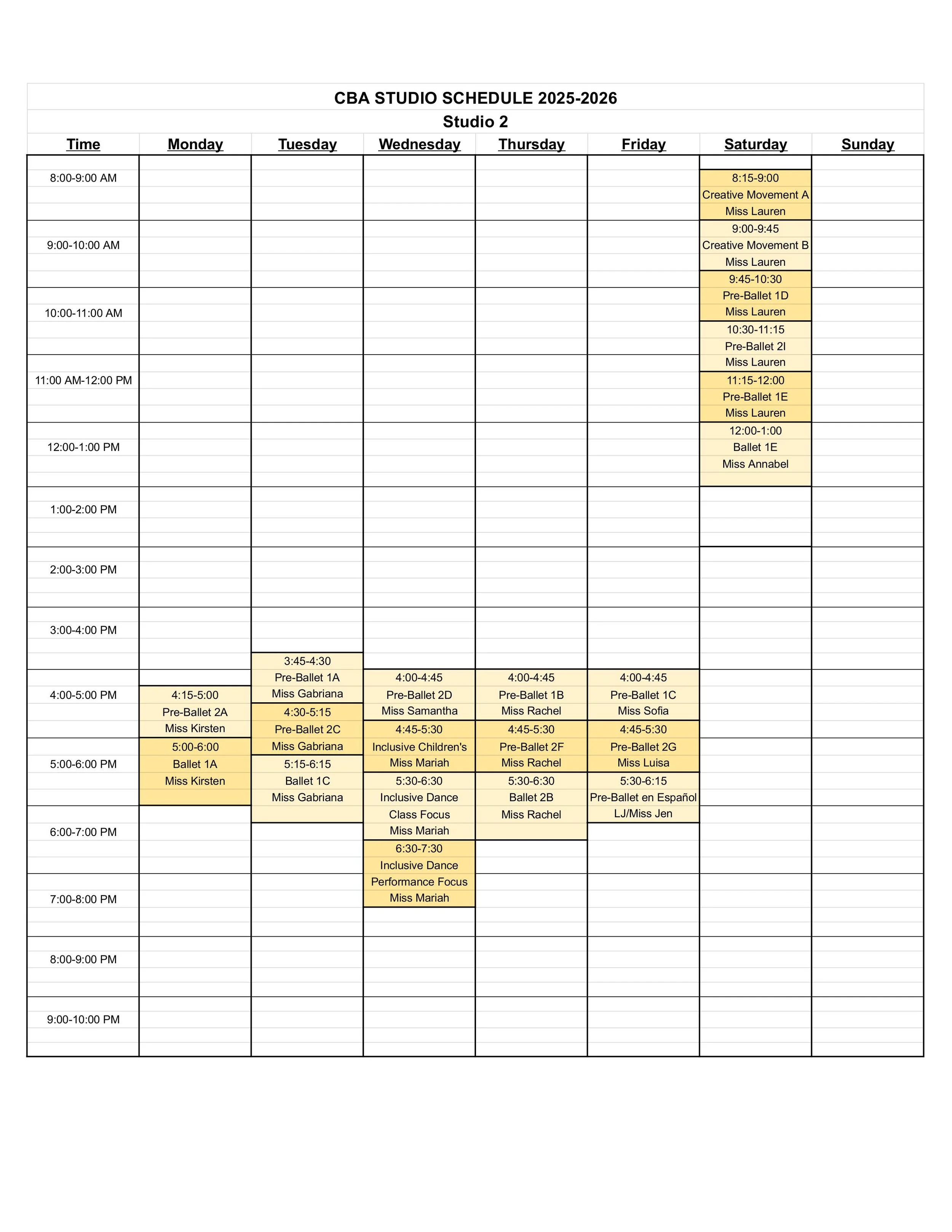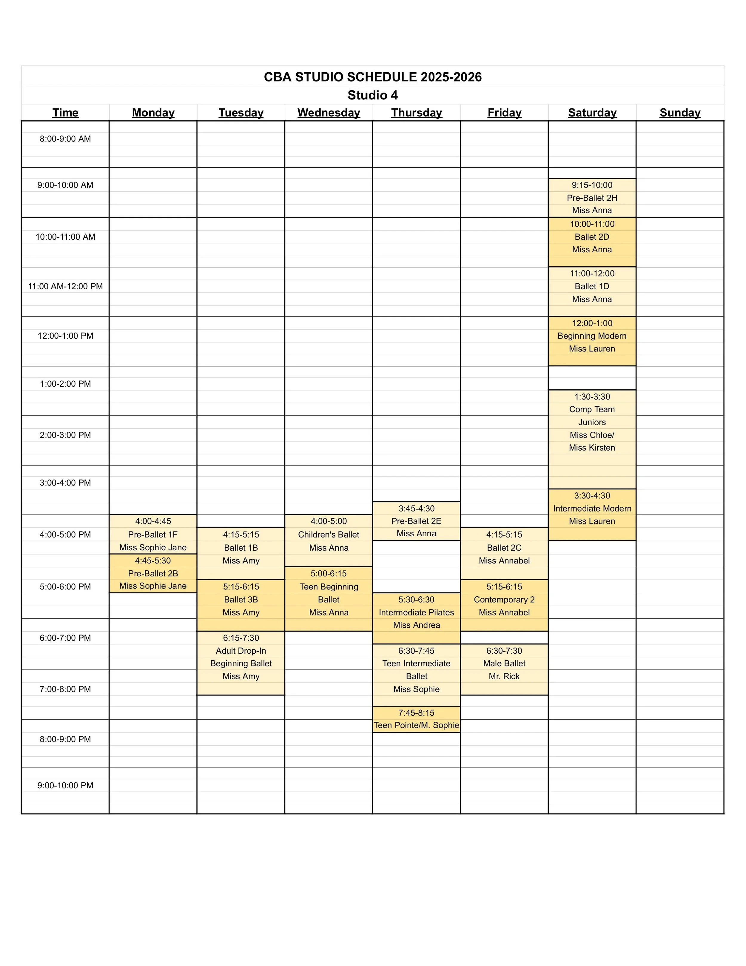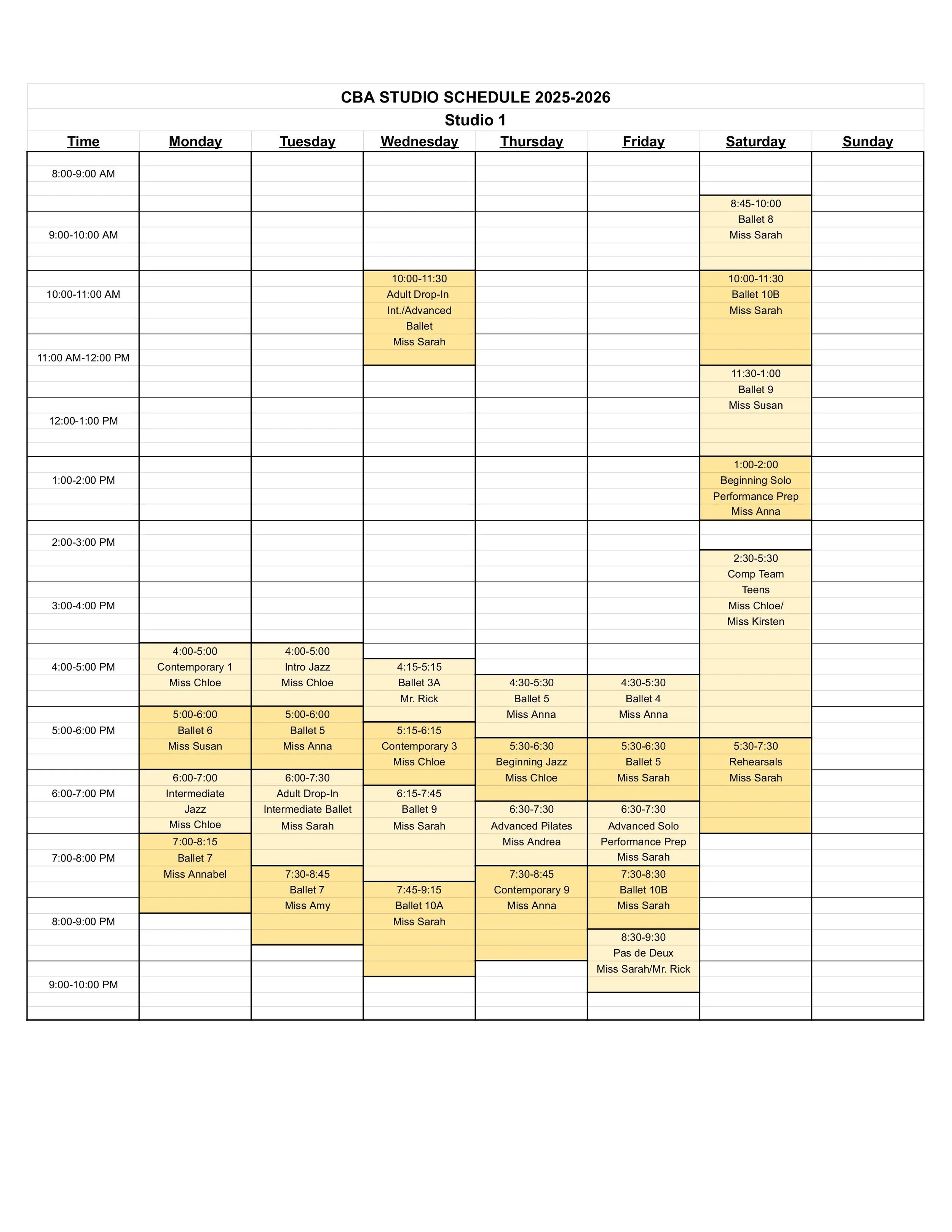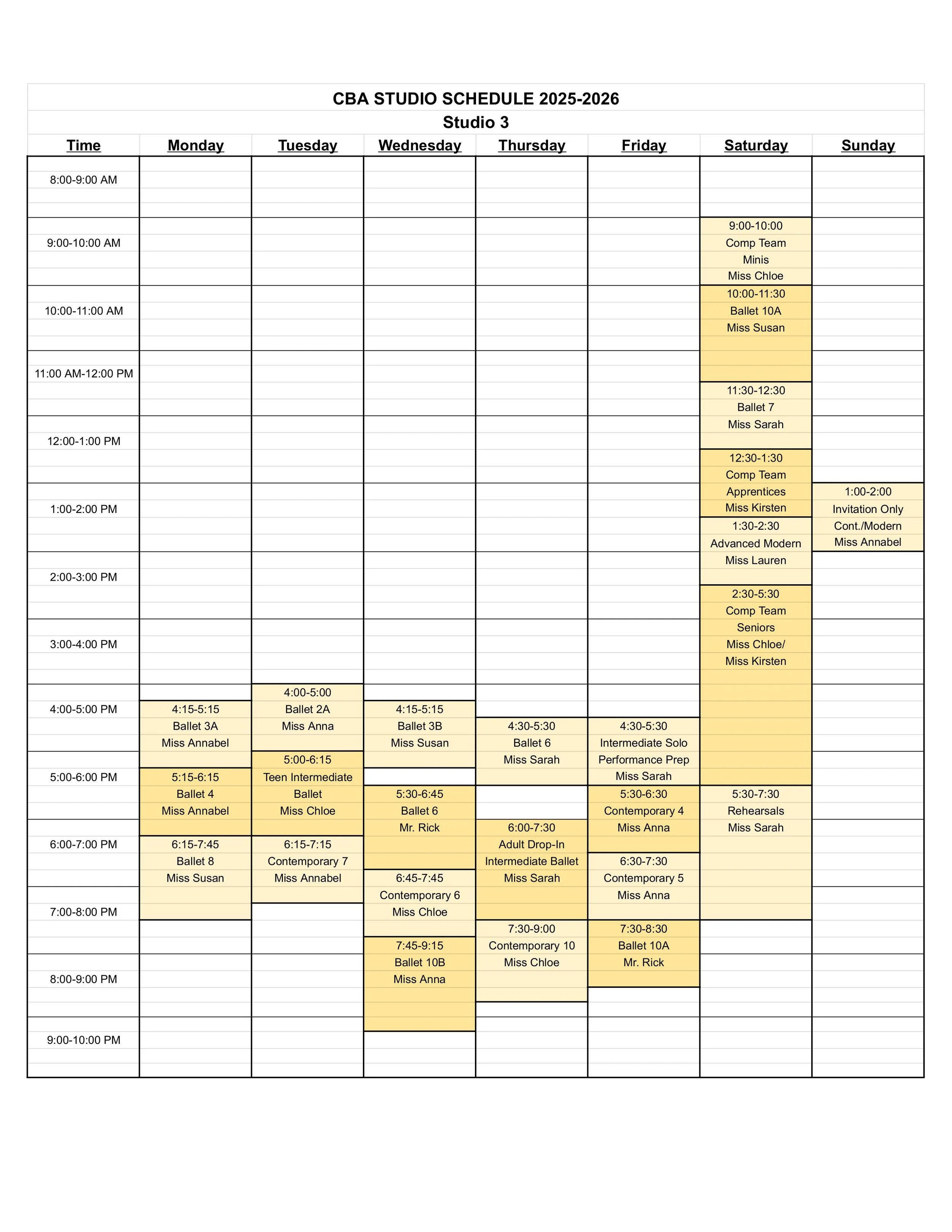 CBA STUDIO SCHEDULE